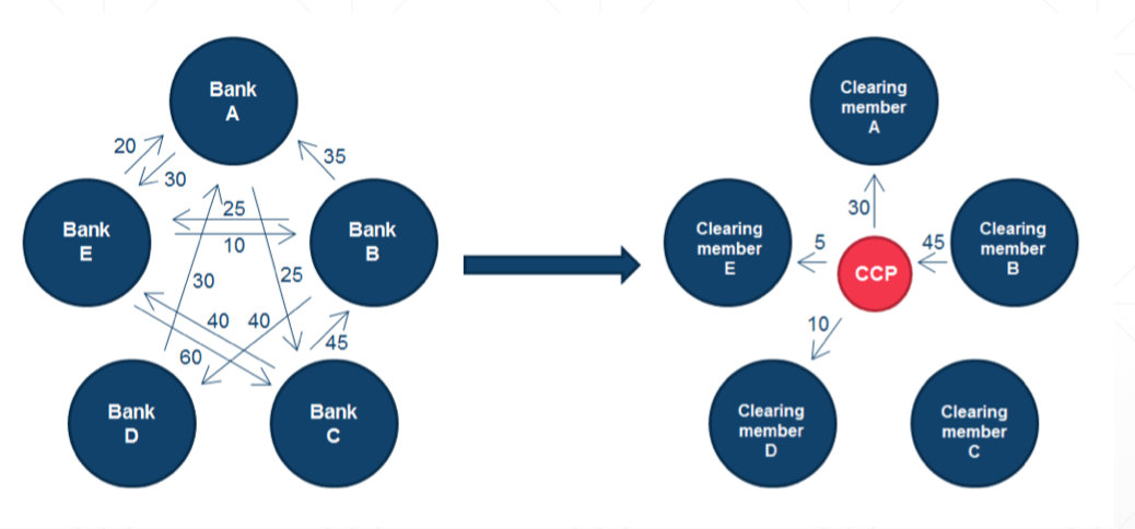 A central counterparty interposes itself between counterparties to contracts traded in one or more financial markets, becoming the buyer to every seller and the seller to every buyer and thereby ensuring the performance of open contracts