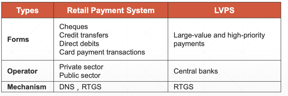 - 大额跨行支付的实时全额结算系统 (RTGS, Real-time gross settlement)。