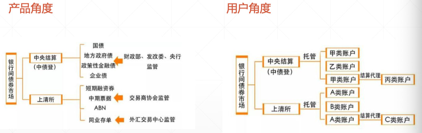 - 从产品角度:可以是中央结算(中债登)去做结算,基本都是政府类的,相对比较大的交易;也可以是上清所进行结算,基本都是公司债券相关的,相对较小的交易。