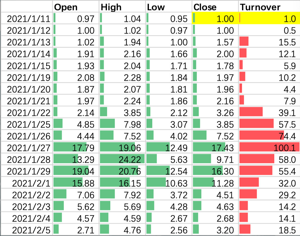 如果用K线图去看,这个事情就更夸张了,大家可以看见一根直线一路上去,在1月27号那天达到了顶峰。可以看到这支股票非常的疯狂。