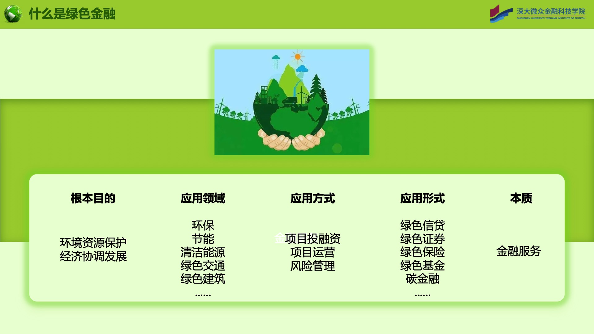 国内外有非常多的定义,这一页给出了一个参考性的解释。首先,绿色金融的本质肯定还是金融服务,是什么样的金融服务?就是以环境资源保护、经济协调发展为根本目的,应用在环保、节能等领域,用项目投融资、运营、风险管理的方式,变现为绿色信贷、债券、保险、基金碳金融等形式的的金融服务。因此,根据这样的解释,绿色金融的最终目的就是使得我们的环境、经济能够可持续发展。