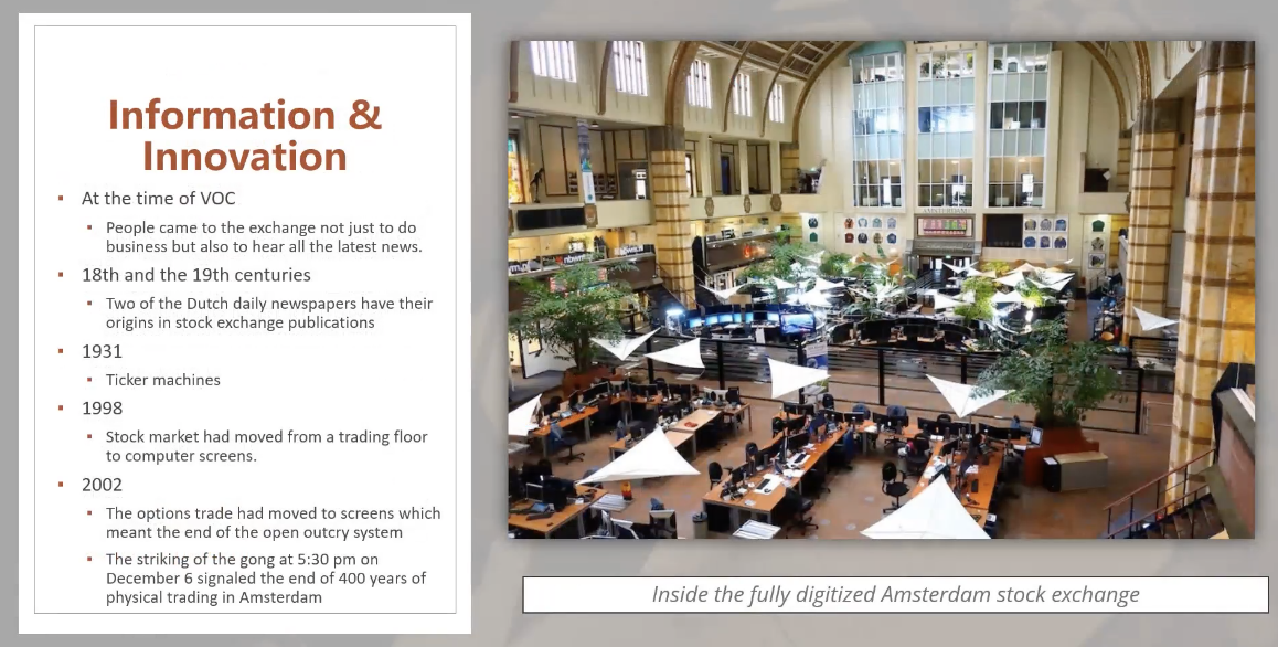 从18世纪开始,阿姆斯特丹也慢慢走上了电子化道路,到了2002年,已经可以看见一些screens,不再是使用传统的喊价模式,而是标准化的matching过程了。