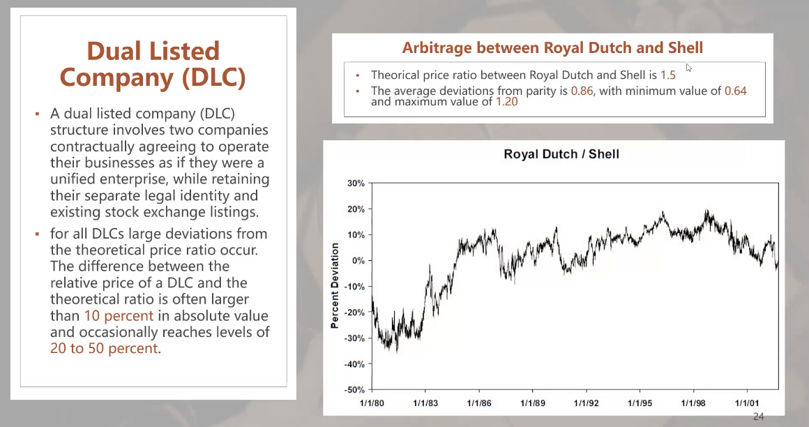 这家公司开始的时候有一个很复杂的业务关系。就是两家公司一起经营,业务的所有成本和赚到的所有的利润都按照固定的比例分配,比如3:2。所以当时叫做Dual Listed Company(DLC),这种情况下,本质是两个公司结合成了一个实体,但是这两家公司的股票又在两个地方上市,所以按照成本和利润的比例(3:2),因为所有东西都是一样,正常来说两家公司的股票价格应该是1.5:1。