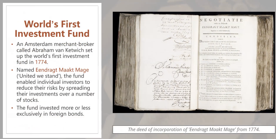 下一步为了解决有一些人想投资证券市场,但是又不会炒股票的难题,1774年阿姆斯特丹出现了第一支股票基金(Investment fund),这个基金当时是有一个投资范围的,主要投资外国债券。
