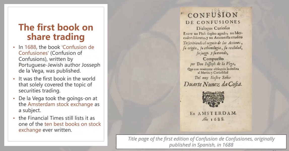 有了交易之后,就开始有人教大家如何买卖股票。1688年出现了第一本教人怎么买卖股票的书《confusion of confusiones》,英国金融时报还把这本书评为十本最佳的股票交易书籍之一。所以其实我们现在想到的所有事情,很久以前就都有人开始做了,非常有意思。