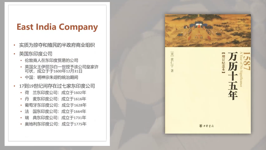黄仁宇先生的《万里十五年》写到了历史上的东印度公司,这个时候东西方已经差别很大了。这个时候西方已经成立了很多殖民性质的半政府商业组织,就是东印度公司,但是最出名的还是荷兰东印度公司和英国东印度公司,其他东印度公司的存在时间比较短。