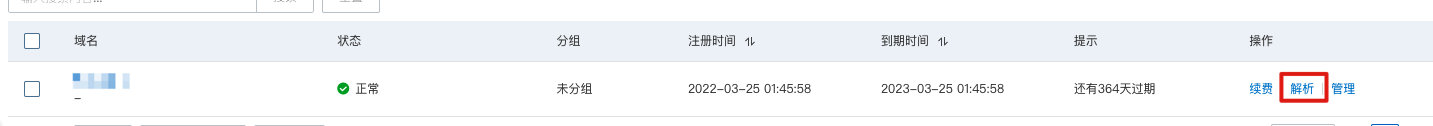 等一系列审核完之后,回到自己的阿里云域名控制台,就可以刚刚购买的域名处于正常状态了。接着点击解析进行云解析。