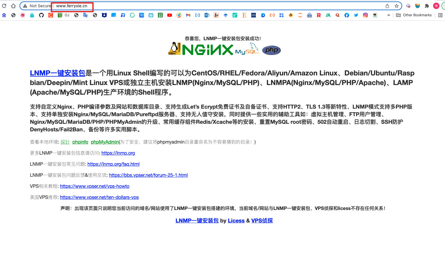 这个时候的网站还是http的访问方式,所以会提示网页不安全,所以还需要部署https的加密访问方式。