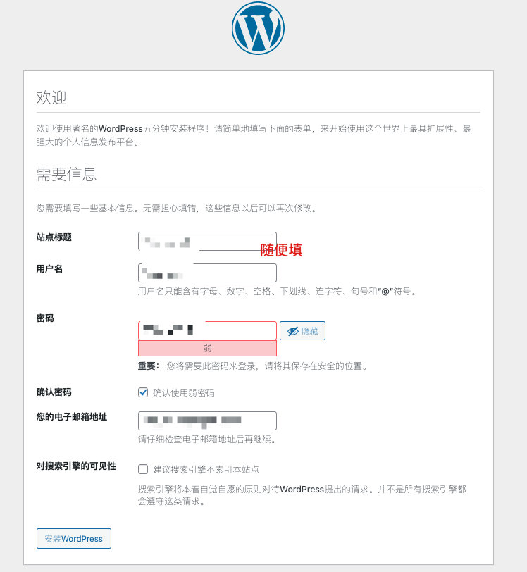 最后就是配置用户信息了。需要注意的是,这里设置的用户名和密码是你用来登录 WordPress用户后台的,所以需要记住。