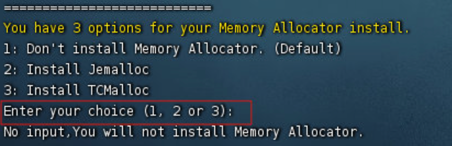 回车进入下一步,选择是否安装内存优化。可以选择不安装、安装Jemalloc或安装TCmalloc,这里直接按Enter默认为不安装。
