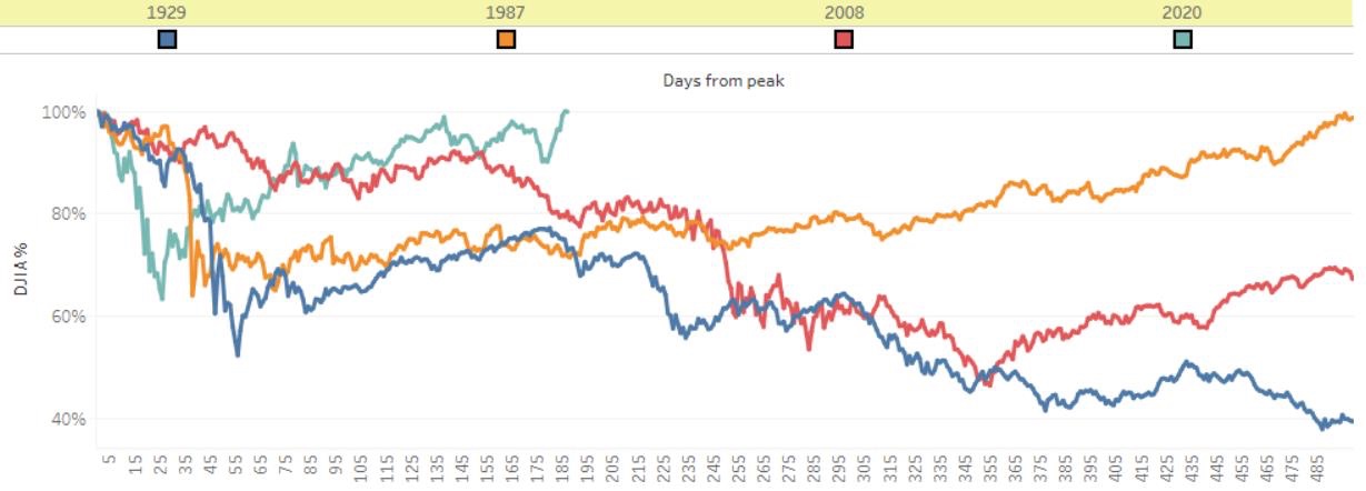从下图的对比可以看到者四次股灾的时间、触底时间、跌幅、恢复时间。总的而言,1929年的股灾跌幅比较厉害,几乎3年才触底,而且一直用了22年才恢复,相比而言,2020年的股灾由于疫情跌的很快,但反弹恢复也是最快的。