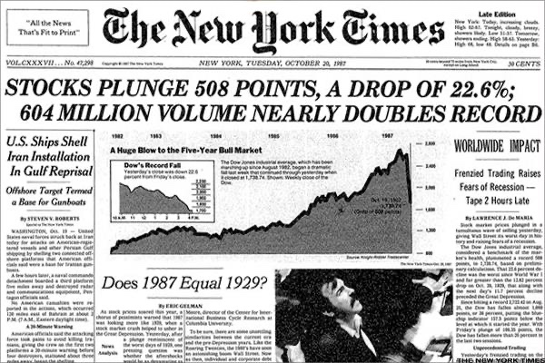 1987年10月20号的纽约日报,从下图的标题可以看到“跌了508点,单日跌幅22.6%,交易量基本上翻倍”,“1987年和1929年是不是一样的?”等词,可以看到87年的股灾确实是很严重。