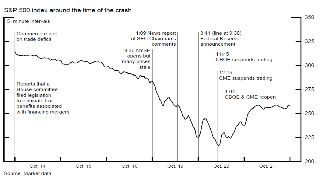 - Role of program trading strategies (program trading的策略在中间也起到了推动作用,现在Portfolio Insurance已经不太流行了,因为发现在跌市的时候根本起不到保险作用,保险公司还是要破产 )