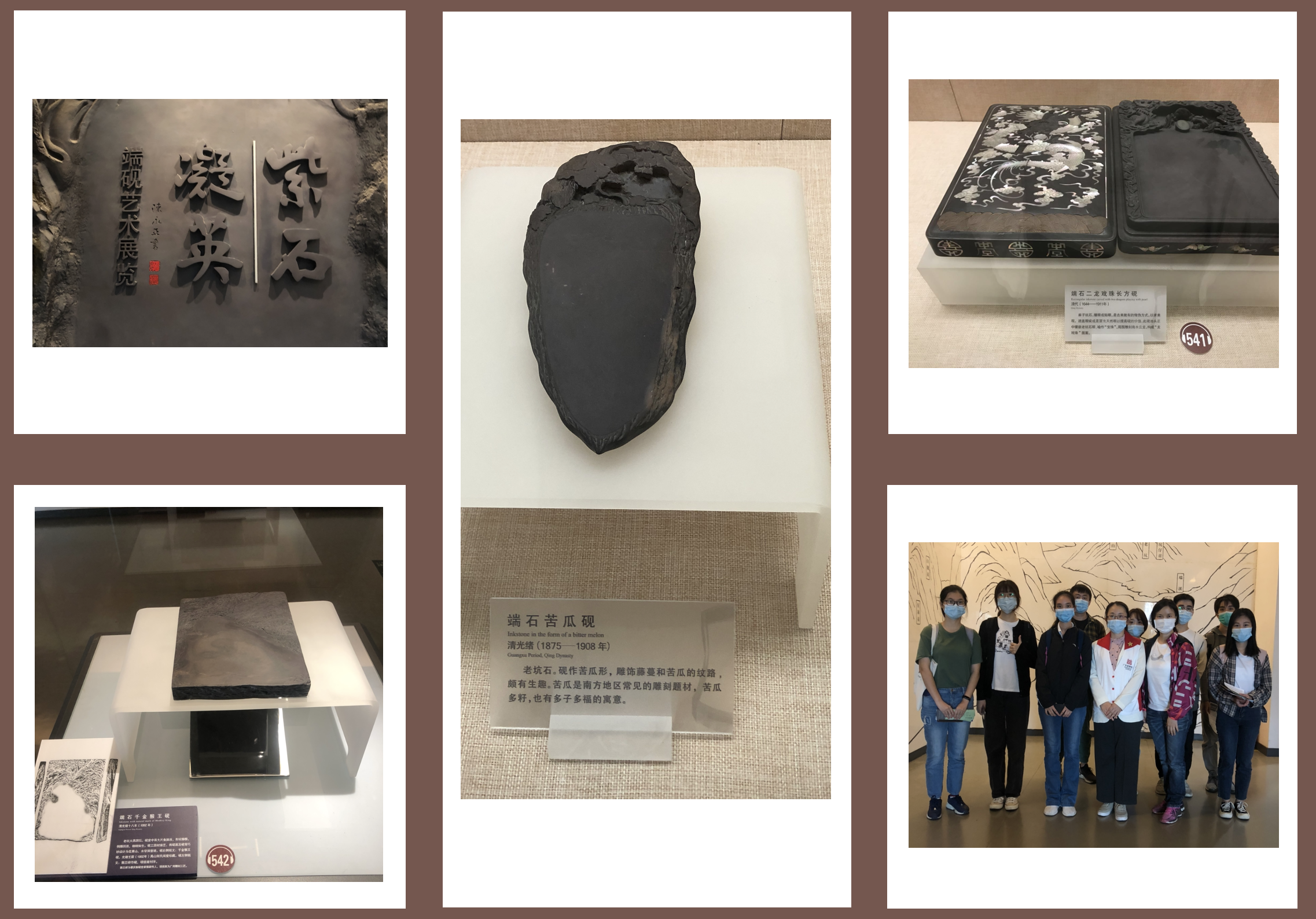 梁老师首先为我们详细介绍了砚的各个部位,让我们对砚有一个更深入的了解。其次,她引领我们一个个参观展品,按照朝代、砚的样式等分门别类的详细介绍。讲解途中,梁老师也为我们普及了许多相关小知识。比如,砚本身不会发色,只是研磨工具,最后墨汁的呈现颜色由墨条决定。