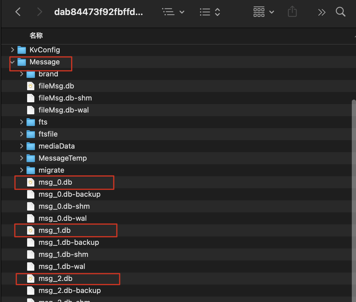 所有的微信聊天记录就保存在这个Message 目录下的db数据库文件,我们只需要拿到这个目录下的所有形如msg_0.db的数据库文件即可。