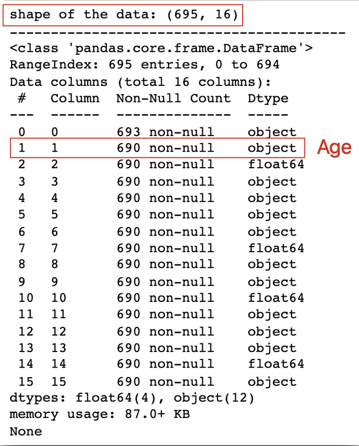通过data.shape命令查看数据集格式,发现数据格式为(695, 16),通过data.info()查看数据集变量类型,如图2所示,数据集包含数值和非数值类型(float64和object)。其中,特征2、7、10和14是数值类型,其他都是非数值类型。