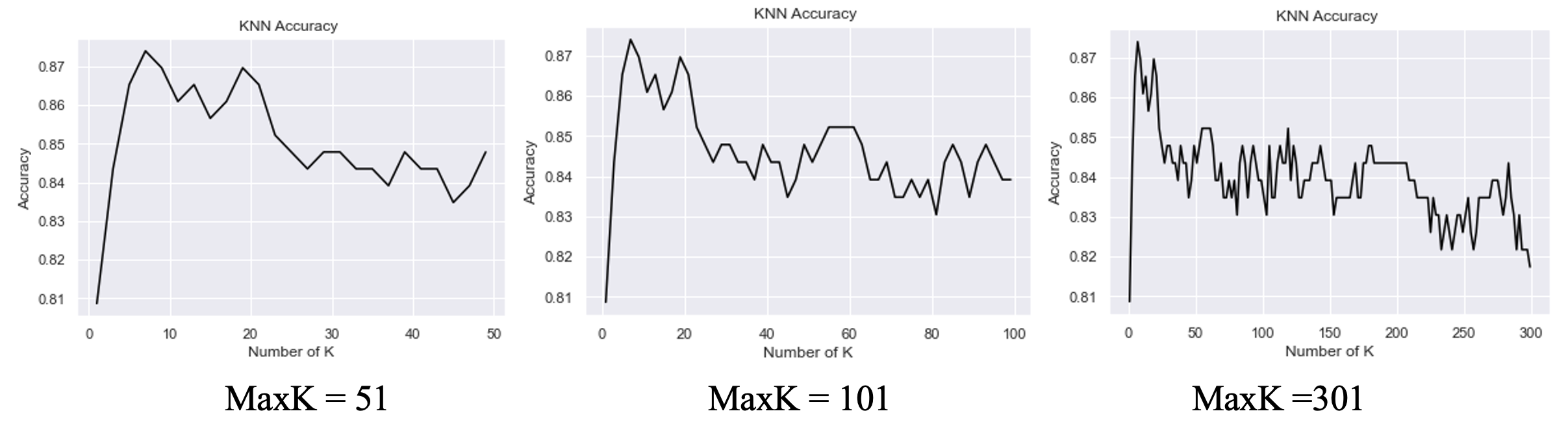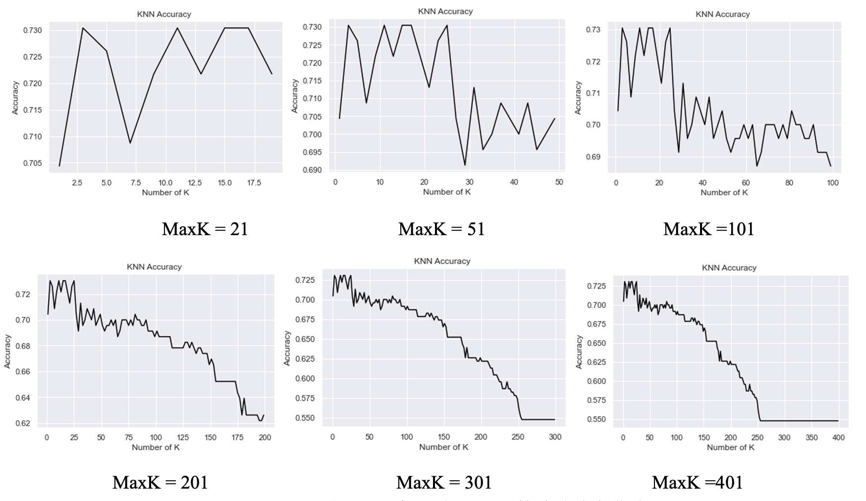 从表3可以看出,根据maxK的变动,可以看到KNN对此数据集分类预测的最大准确率为73.04%,此时k=3,可能由于样本量过少,这个准确率表现较为一般。且随着k的增加,当k达到255后,算法的准确率将稳定在64.63%,保持在最低准确率。