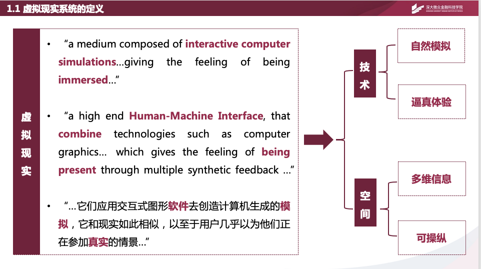 但首先需要澄清的是,这不能作为虚拟现实的定义。通过文献调研,我们发现,其实虚拟现实是一个十分严肃的研究课题,除此之外,还有很多的应用场景,认识到这一点是非常重要的。