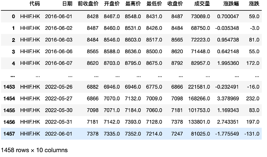下图2、图3、图4分别是HSIF、HHIF、TCHF的数据列表,从中可以看到期货历史数据的基本情况。其中,日期、收盘价、涨跌幅是关键指标。