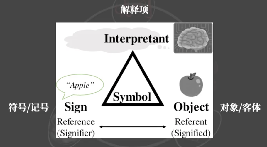 - 解释项(Interpretant),符号(苹果的音)加上客体(苹果)没有意义,它在对方的脑子里面唤起的心理内容,唤起的解释项才是意义所在。