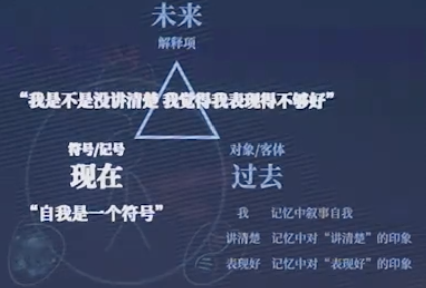 符号自我论的理论家认为:这三个要素,分别对应了我们的过去、现在和未来的三种心理时间性。