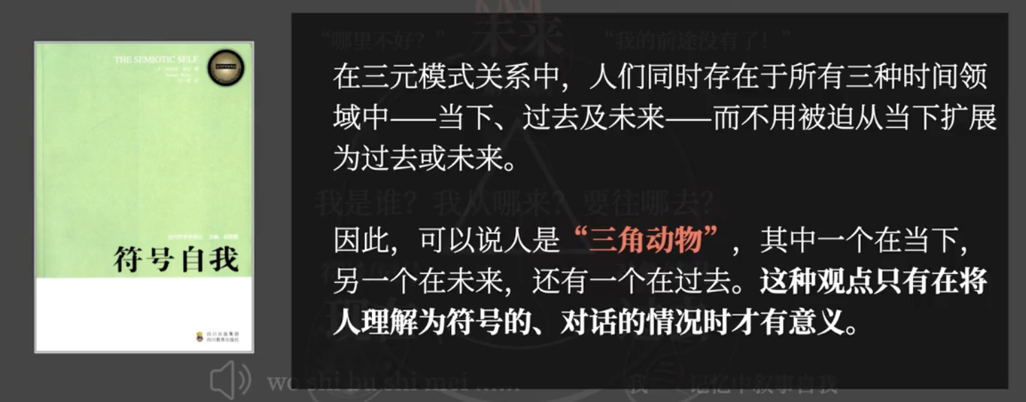 符号自我理论一个非常基本的认识是,我们的内心对话本质上是一种三边对谈,是当下的我向未来的我谈论着过去的我。(《符号自我》)