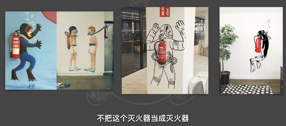 把灭火器看作是氧气,把食物看作衣服,把食物看作动物…正如前面举的那个例子,当我不把被子当成被子的时候,山川湖海、鸟兽虫鱼就涌入了我的脑中…