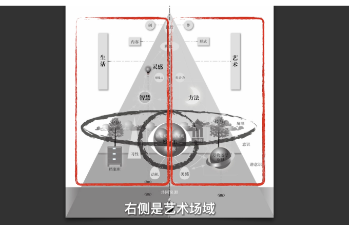 关于「创意」,最好的创意书籍之一是赖声川先生的《赖声川创意学》,其中有一张高度概括的创意金字塔:金字塔的顶端是作品,左侧是生活场域,右侧是艺术场域,它们各自连接着底部的创意源泉。