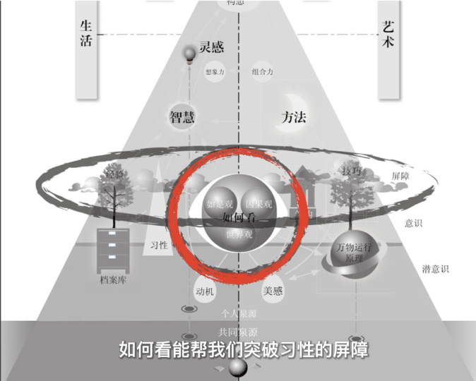 我们注意这个金字塔的腰部,意识与屏障所在的部分,居于最核心的,就是「如何看」,它决定了我们是否能突破习性的屏障,打通创意的通道。