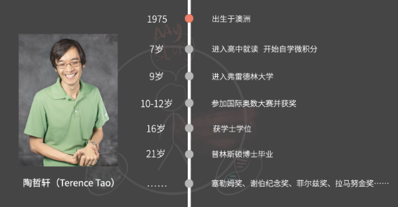 下面我们让华裔数学天才陶哲轩现身说法,根据维基百科的资料,此君 7 岁就开始自学微积分,并进入高中就读,16 岁大学毕业,21 岁普林斯顿博士毕业,随后获奖无数。