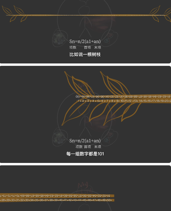 上半根的每一组数字都能与下半根中的数字纵向相加,结果每一组数字相加的结果都都相同,都是 101,由于木棍被拦腰折断(除以二),因此一共有 50 组 101,相乘的结果就是 5050。进而归纳出了适用于所有等差数列求和问题的解题规律:项数的一半乘以首项加末项,也可以表达为:先折断树枝,然后用枝头对上枝尾,然后用半根树枝的长度乘以枝头加上枝尾的高度。