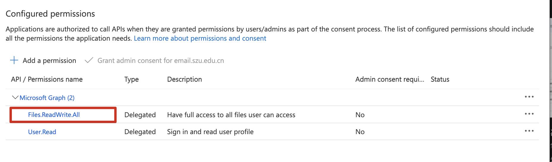 完成之后,按照说明文档还需要点击用管理员同意才能拥有读写权限,但笔者进行到这一步,发现尝试了各种方法都没法完成权限设置。(注意:应该选择委托的 Files.ReadWrite.All(如上图),而不是应用程序的 Files.ReadWrite.All!)